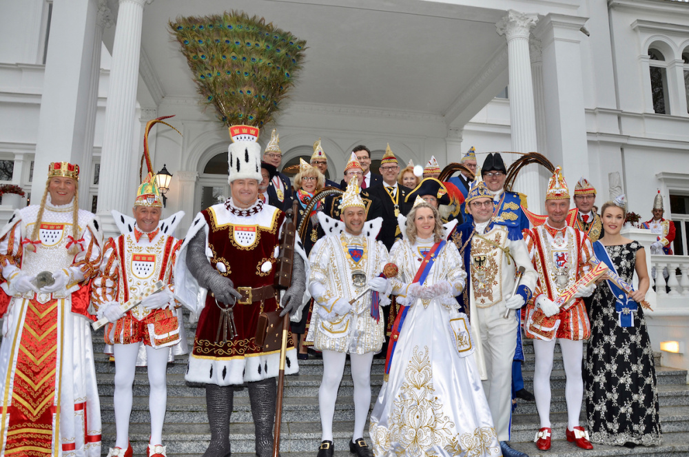 Die Villa Hammerschmidt in Bonn, der frühere Sitz des Bundespräsidenten, war heute Schauplatz eines außergewöhnlichen Spitzentreffens rheinischer Karnevalisten. Auf Einladung der Beethoven Jubiläums GmbH trafen sich dort die Tollitäten der rheinischen Karnevalshochburgen Aachen, Bonn, Düsseldorf und Köln - darunter auch das Prinzenpaar der Landeshauptstadt Düsseldorf, Prinz Axel I. und Venetia Jula, sowie eine Abordnung des Comitee Düsseldorfer Carneval e.V. mit Präsident Michael Laumen an der Spitze. Zu den Programmpunkten des zweistündigen Treffens gehörte u.a. ein Gruppenfoto auf der rückwärtigen Treppe der Villa Hammerschmidt. Zu Ehren des in Bonn geborenen Komponisten werden übrigens in allen vier Rosenmontagszügen identische Wagen mitfahren. Wie genau diese aussehen werden, wurde bei dem Spitzentreffen noch nicht verraten.