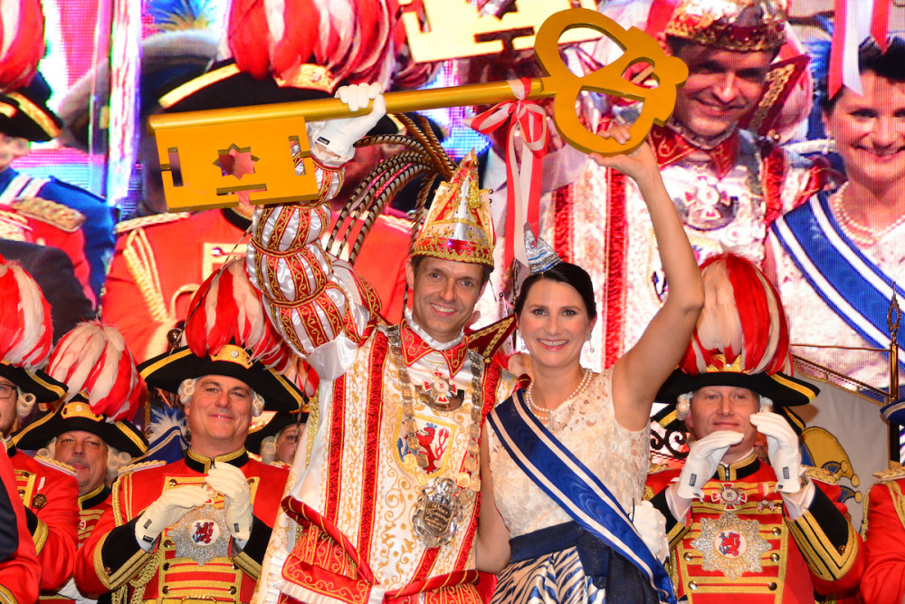 Seit Freitag, 20:47 Uhr, hat die Landeshauptstadt Düsseldorf ein neues Prinzenpaar: Vor 1000 begeisterten Gästen in der Stadthalle – unter ihnen Landtagspräsident André Kuper und Innenminister Herbert Reul - kürte CC-Präsident Michael Laumen in einem rot-weissen Konfettiregen die Bürger Martin Meyer und Sabine Ilbertz zu Prinz Martin I. und Venetia Sabine. Vorausgegangen war ein grandioser Einzug in die prachtvoll dekorierte Stadthalle mit den beiden Prinzengarden der Stadt und ihren Musikzügen. Oberbürgermeister Thomas Geisel gratulierte dem Prinzenpaar als erster: „Ihr seid ein fantastisches Prinzenpaar“. Anschließend überreichte er den neuen Tollitäten den goldenen Stadtschlüssel und trat damit symbolisch „in den vorübergehenden Ruhestand“. Geisel: „Ich weiß aber die Geschicke der Stadt in den allerbesten Händen!“