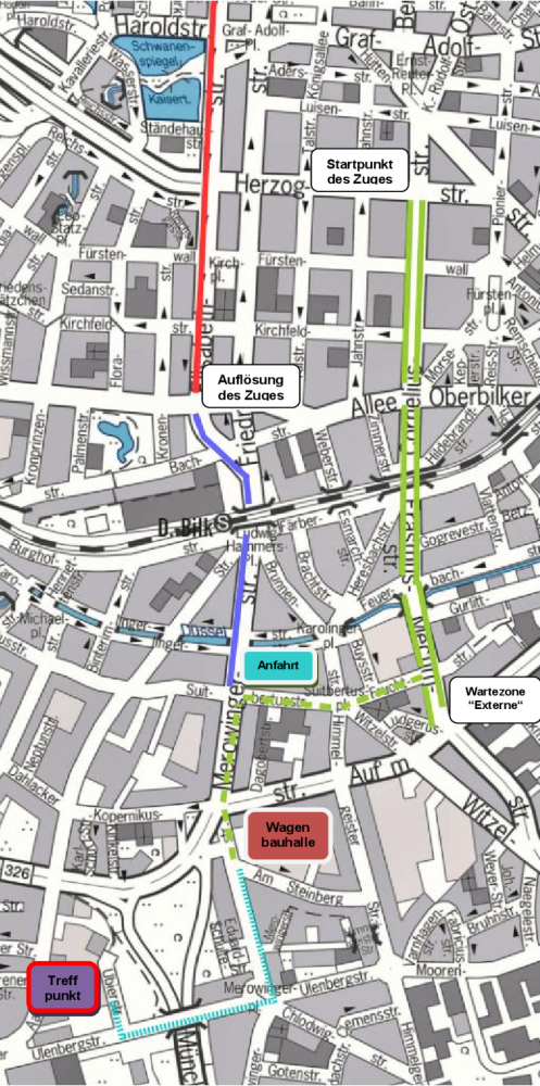 • Die Anfahrt zur Aufstellstrecke für Gesellschaftswagen erfolgt über die Merowingerstr. – Suitbertusstr. – Suitbertusplatz – Fruchtstr. – Mecumstr. (siehe Plan)