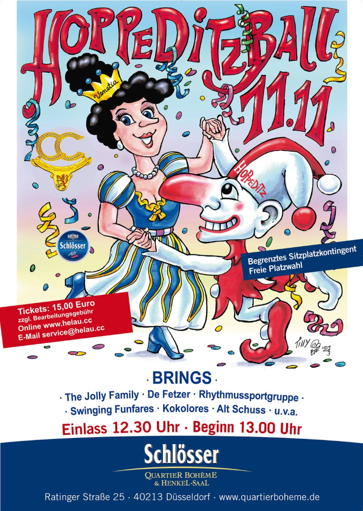 Tickets für den Hoppeditz-Ball kosten nur 15 Euro zzgl. Vorverkaufsgebühr und sind ab sofort unter www.helau.cc und service@helau.cc sowie an der Tageskasse erhältlich.